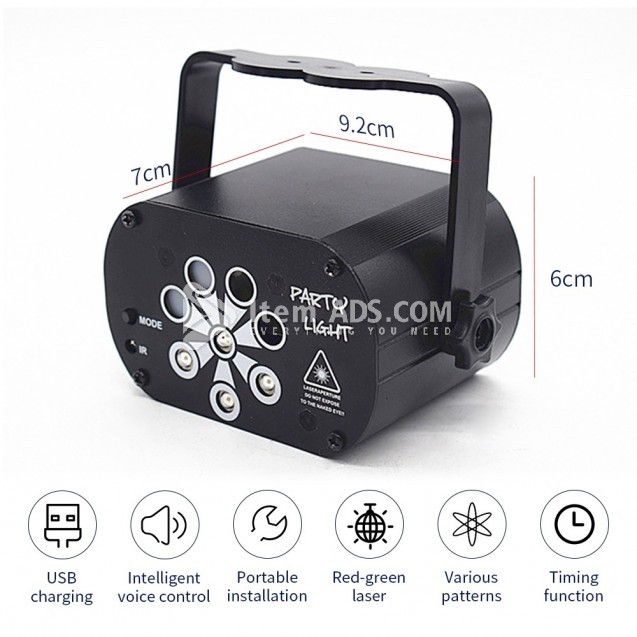 * IR remote,Compared with other portable stage lights, our cordless laser lights are designed with voice-activated mode or intelligent mode, you can easily switch between the two modes by pressing the button. the remote control power by 2*CR2025 battery(Battery Not Include in the package)