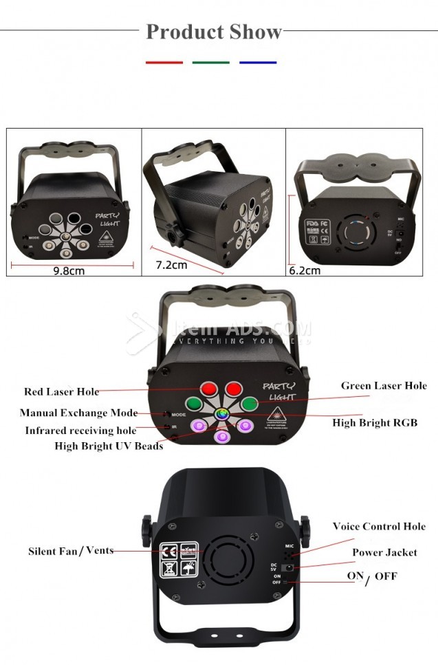 Sound Activated Remote control 8 lens 240 patterns Stage DJ disco light red and green light with background light could shine / move / merge / appear / disappear / flash to the beat of music, Creating a fantastic atmosphere. Just enjoy the colorful night. Upgraded Visual Effect for RGB color + background design. 3 beam combinations (red, green, red &green), 6 color backgrounds (red, green, blue, red & green, red& blue, blue &green), Providing you with an unforgettable experience of laser light show