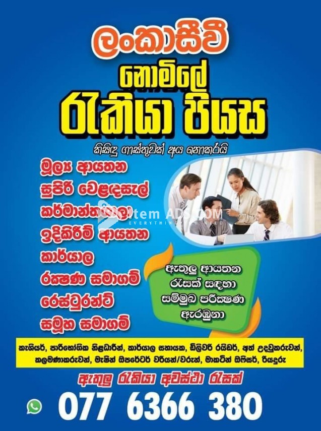ලංකා සීවී .නොමිලේ රැකියා පියස කිසිදු ගාස්තුවක් අය නොකරයි. මූල්ය ආයතන, සුපිරි වෙළෙඳසල්, කර්මාන්තශාලා, ඉදිකිරීම් ආයතන, කාර්යාල, රක්ෂණ සමාගම් ,රෙස්ටූරන්ට්, සමූහ සමාගම් ඇතුළු ආයතන රැසක් සඳහා සම්මුඛ පරීක්ෂණ ඇරබුණා. කැෂියර්,පාරිභෝගික නිලධාරීන් කාර්යාල සහායක delivery rider අත්උදව්කරුවන් කළමනාකරුවන් මැෂින් ඔපරේටර්වරියන් marketing officer රියදුරු ඇතුළු රැකියා රැසක්