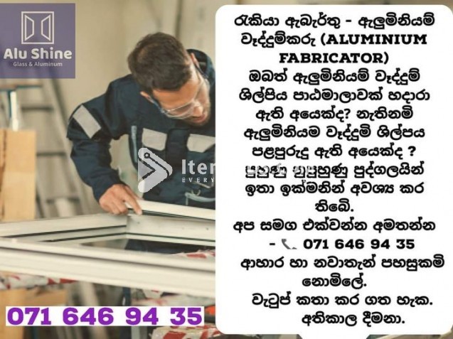 ඔබත් ඇලුමිනියම් වෑද්දුම් ශිල්පිය පාඨමාලාවක් හදාරා ඇති අයෙක්ද? නැතිනමි ඇලුමිනියම වෑද්දුමි ශිල්පය පළපුරුදු ඇති අයෙක්ද ? පුහුණු නුපුහුණු පුද්ගලයින් ඉතා ඉක්මනින් අවශ්ය කර තිබෙි.