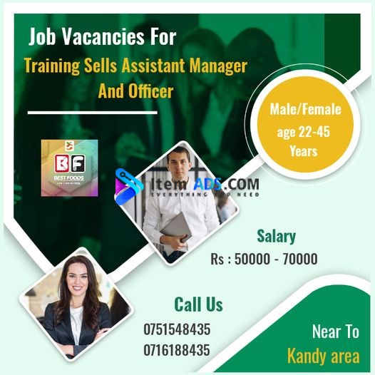 පුහුණුව සදහා විකුණුම් සහයක කලමනාකරුවන් සහ කාර්යාල නියෝජිතයන් අවශ්යකර ඇත. මහනුවර,කටුගස්තොට ,තලාතුඔය,හගුරන්කෙත සහ මාරස්සන නගර වලට නොදුරෙන්.
