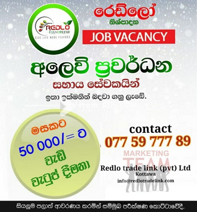 👉Redlo Trade Link (pvt) Ltd අප ආයතනයට අලෙවි ප්රවර්ධන සහායකයින් සදහා හදිසි බදවා ගැනීම්...
