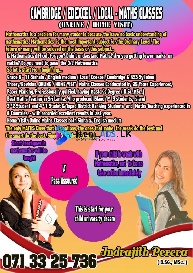 • Grade 6 - 11 English medium ( Local , Edexcel , & Cambridge & KS3 Syllabus) Theory / Revision , Home visit / Online Maths classes conducted by 25 years experienced, Paper marking, Professionally qualified , having Master’s Degree ( B.Sc. , MSc., ) Best Maths Teacher in Sri Lanka who produced Island 1st 3 students, Island 3rd 2 students and Island 4rd 1 student & Toped District Ranking Students and Maths Teaching experienced in 6 countries, with recorded excellent results in last year