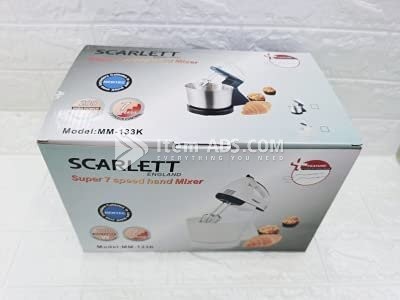 Scarlett 7-speed hand mixer with bowl has everything you need for effortless mixing and includes two stainless steel turbo beater With its Tilt Stand Base and stainless steel bowl Double Snap-On Chrome Dough Hooks & 4-Blade Egg Beater.– Eject safety button